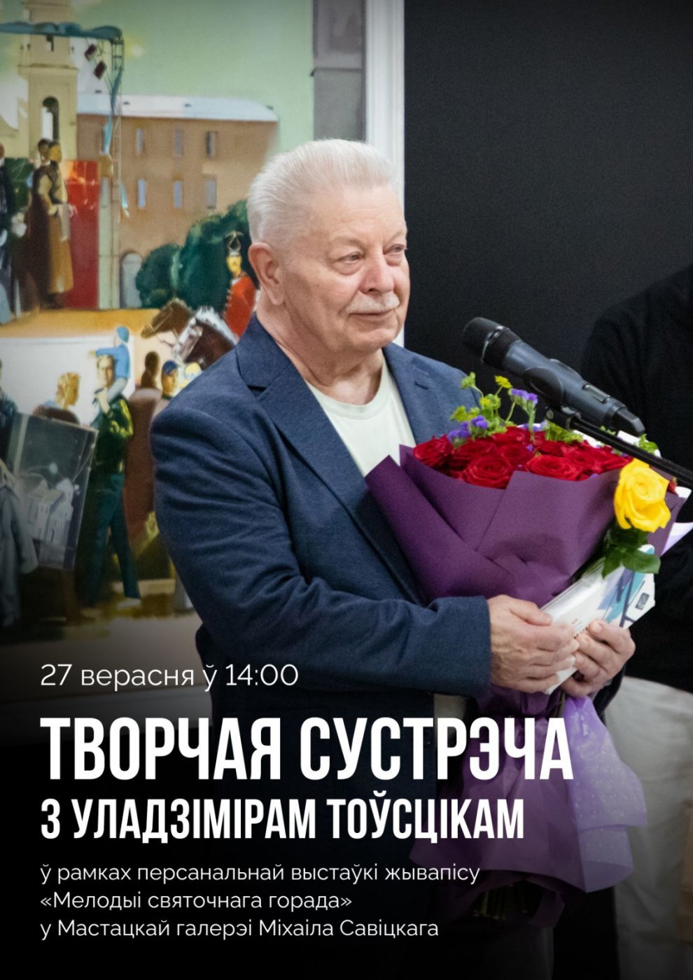 27 верасня 2025 года ў 14.00 у Мастацкай галерэі Міхаіла Савіцкага ў рамках персанальнай выстаўкі жывапісу «Мелодыі святочнага горада» адбудзецца аўтарская экскурсія і творчая сустрэча з народным мастаком Беларусі Уладзімірам Антонавічам Тоўсцікам.